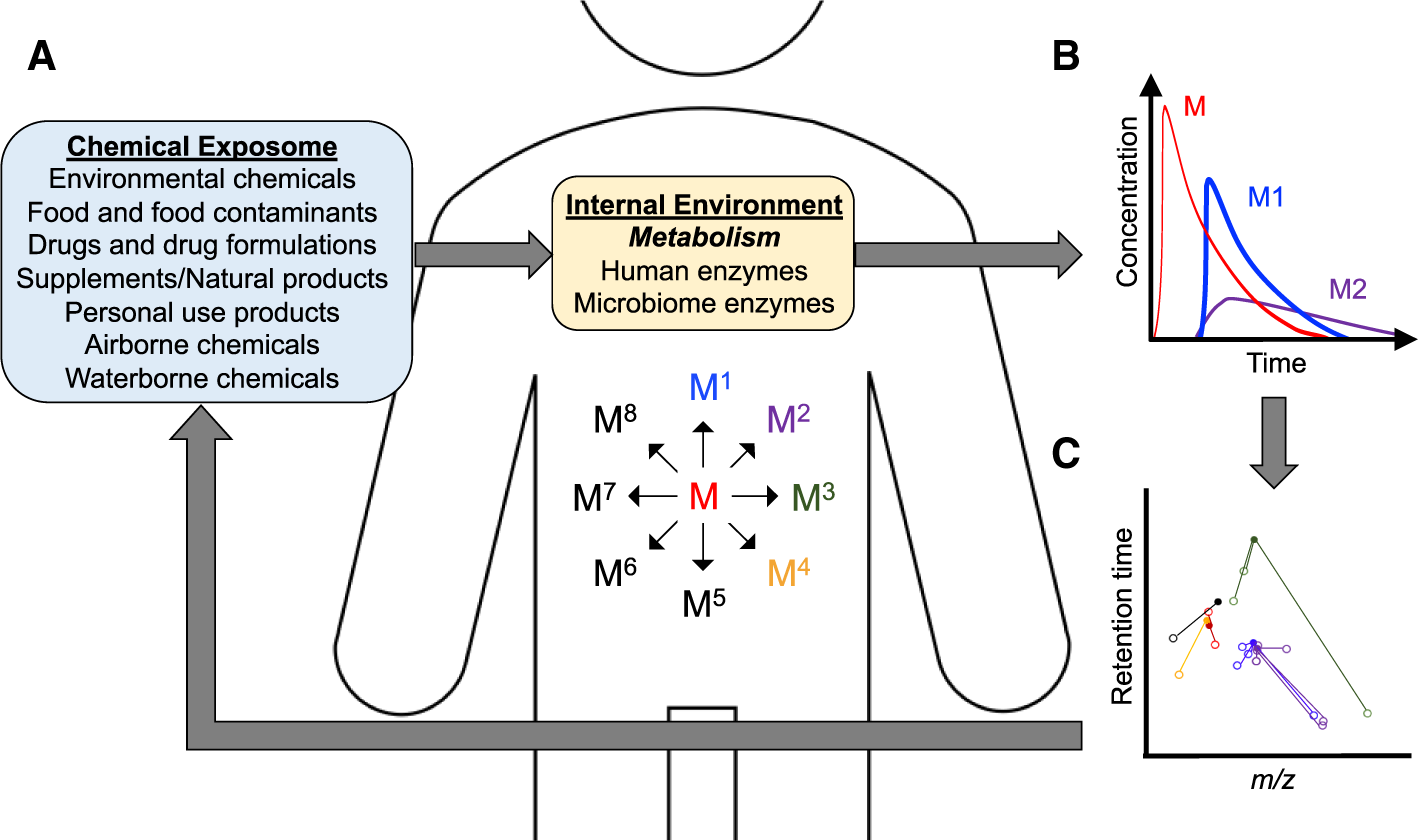 We live in a chemical world, and chemicals live within us. Over the course of our lives, humans are intentionally or unintentionally exposed to chemical compounds in the spaces we inhabit, air we breathe, liquids we drink, foods we eat, drugs and supplements we take, and the products we use. Currently, over 350 000 compounds are documented within the chemical space of potential human exposures,1 with approximately 40 000 compounds having been previously reported in human blood.2 Following exposure, these chemicals can distribute throughout our bodies and be converted into different chemicals via enzymatic biotransformation, light or metal-catalyzed reactions or other spontaneous mechanisms, with both precursors and products potentially impacting cellular functions with implications for human health. Because the accumulation of complex, low-level environmental exposures over the lifespan contributes to human disease risk,3 there is a need for analytical methods capable of delivering “-omics” scale information on environmental exposures.4-6