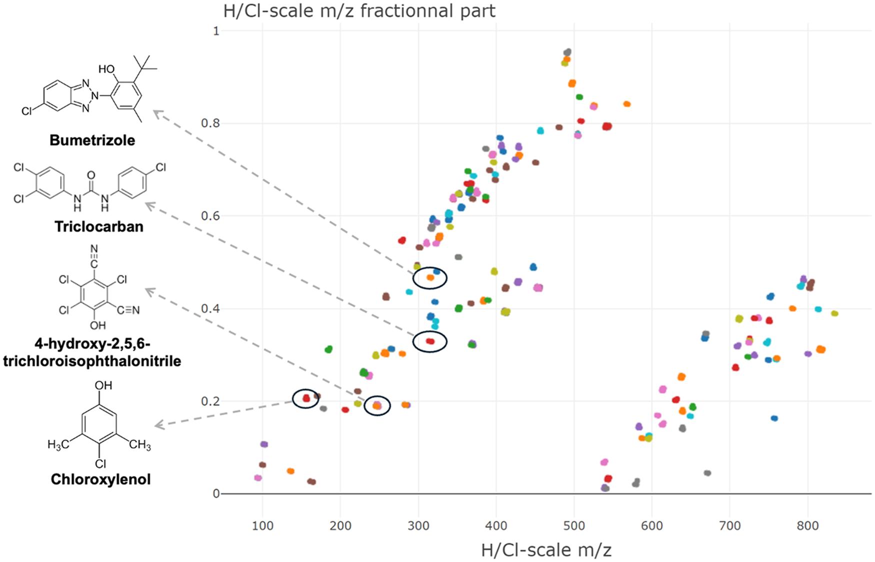 Example of H/Cl-scale mass defect plot (HaloSeeker) of a selected human milk batch with the highlighted clusters for 4 identified chlorinated contaminants. Blank filter set to the sum of the average signal intensity of the features plus 3 times the standard deviation of procedural blanks (n = 3)