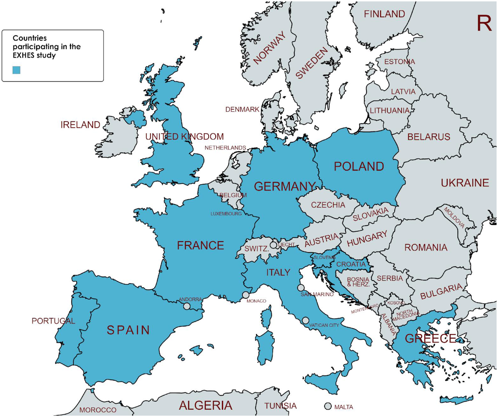 Map of the countries participating in the EHXES cohort (modified by MapChart, https://www.mapchart.net).