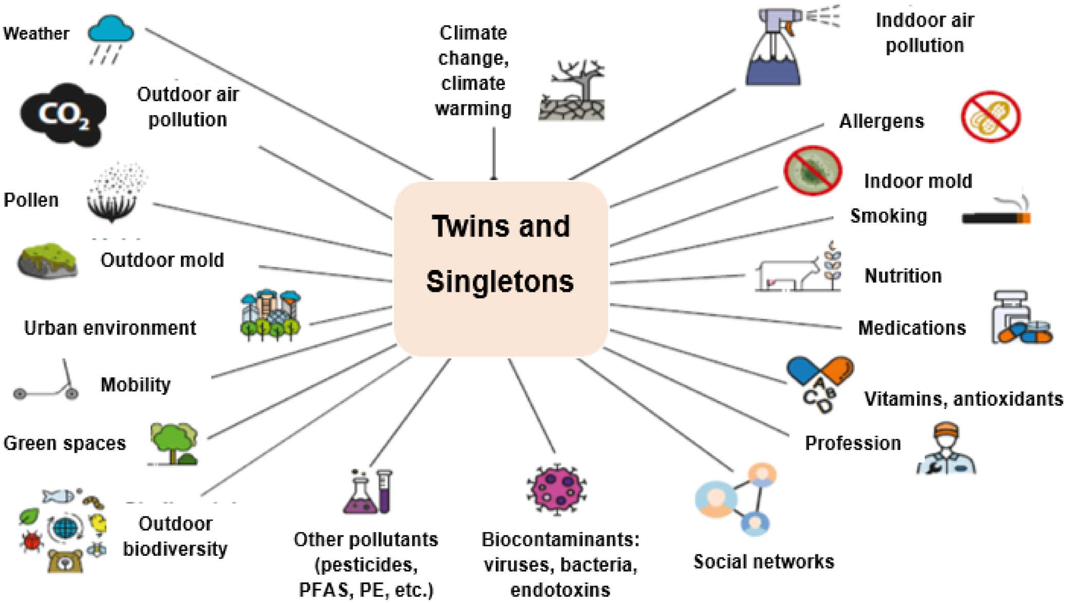 The EXHES study will continue to follow the children to study the impact of the exposome on their health. The combination of twin and singleton cohorts, when enriched with external and internal exposomic data, will allow for a multi-scale systems approach to environmental health. Twin studies serve as a powerful tool to uncover causal pathways and biological embedding, while singleton cohorts ground findings in population health relevance. Together, they provide a robust framework to move from association to causation, and from exposure assessment to actionable insight in the era of climate change and the allergy epidemic. More in detail, these complementary cohorts enable a multi-layered exploration of environmental impacts on health. Twin studies, especially using monozygotic pairs, offer a powerful design to isolate environmental effects from genetic and early-life confounding, enhancing causal inference. In parallel, singleton cohorts provide broader population-level insights into exposure–outcome associations, critical for public health relevance and generalizability. By integrating external exposome data (eg, air pollution, urban environment) with internal markers (eg, metabolomics, epigenetics), the cohorts allow for multi-omics mediation analyses, shedding light on biological mechanisms linking exposures to disease. Moreover, gene–environment interaction analyses can uncover genetically vulnerable subpopulations, informing targeted prevention. Together, these approaches support robust, mechanistically informed, and policy-relevant research on the health impacts of environmental exposures.