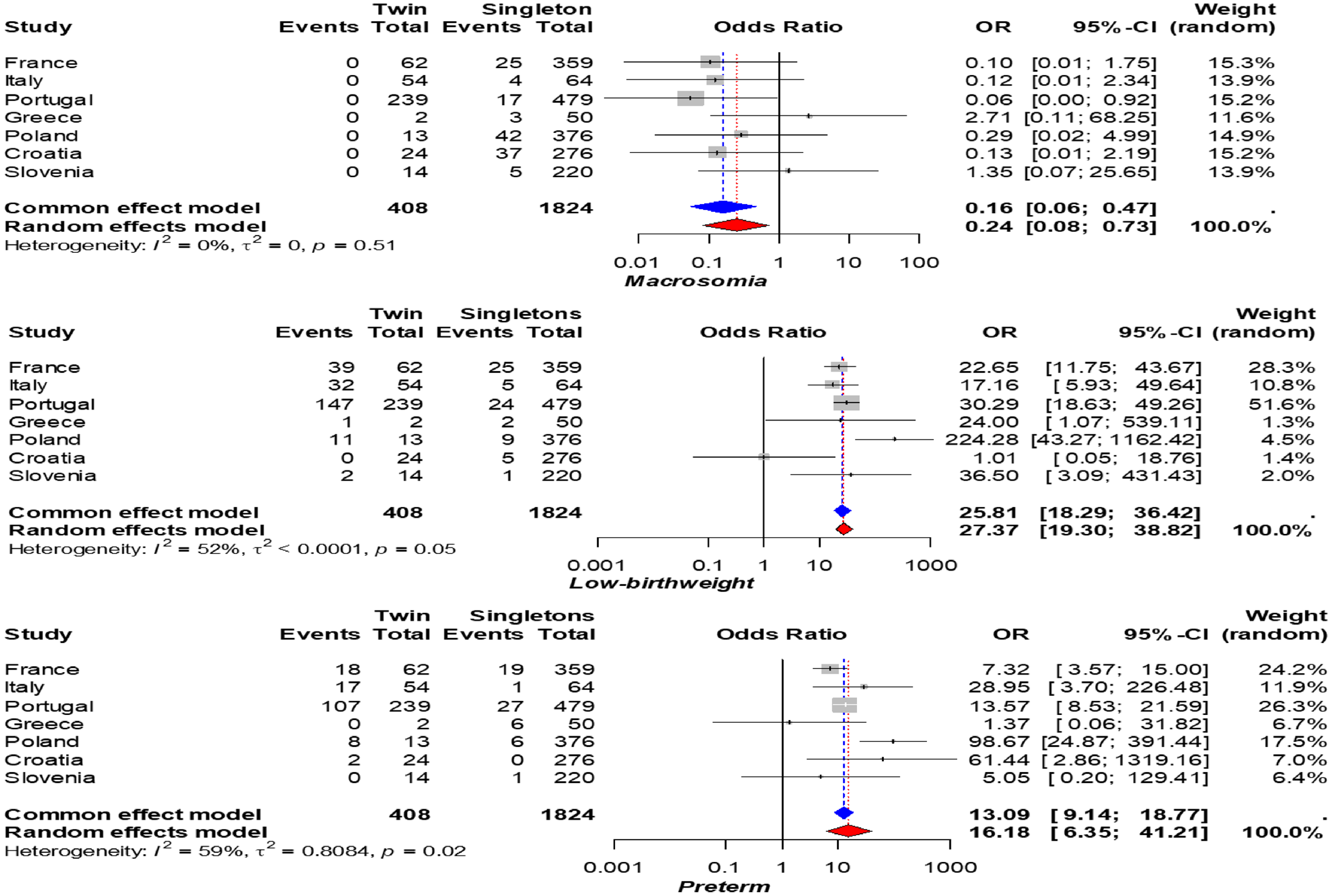 | France | Italy | Spain | Portugal | Greece | Poland | Croatia | UK | Slovenia | Pooled M = 2356 OR or SMD comparing twins to singletons [95% CI] | ||||||||||||