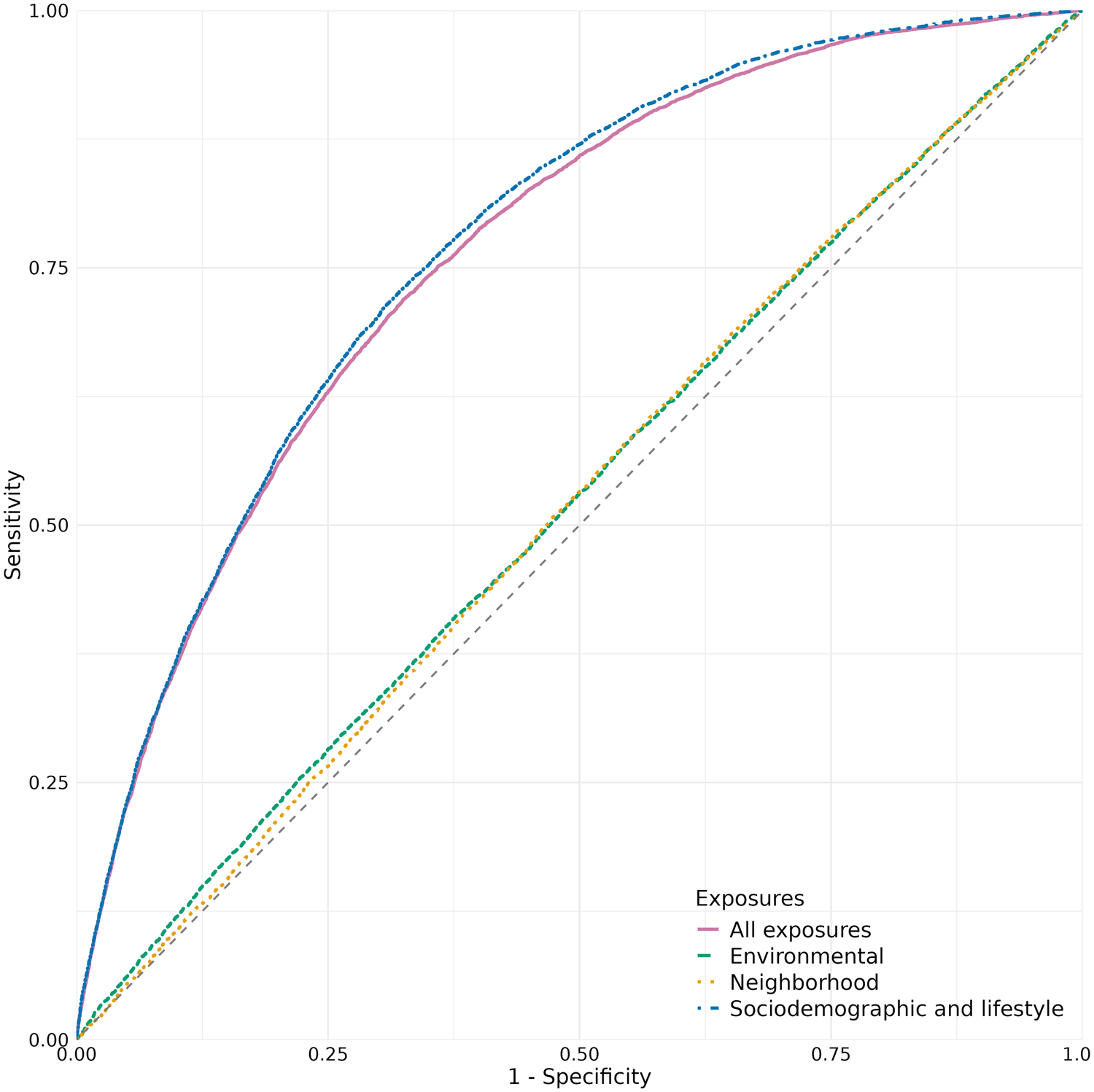 Figure 1 shows the ROC of random forest (RF) models predicting DM-2 status in the total population. ROC curves were plotted for the separate RF models including all exposures, as well as for the subsets of sociodemographic, lifestyle, environmental, and neighborhood exposures. Based on the validation dataset, the area under the curve (AUC) value for the RF model including all exposures (0.76, 95% confidence interval (CI) = [0.76-0.77]) and the AUC of the RF model including only sociodemographic and lifestyle exposures (0.77, 95% CI = [0.77-0.78]) were similar. The AUC values of the RF models including only environmental exposures (0.52, 95% CI = [0.52-0.53]) and only neighborhood exposures (0.52, 95% CI = [0.51-0.53]) showed low discriminatory ability and were lower than the AUC value of the RF models including all exposures and sociodemographic, lifestyle and exposures.