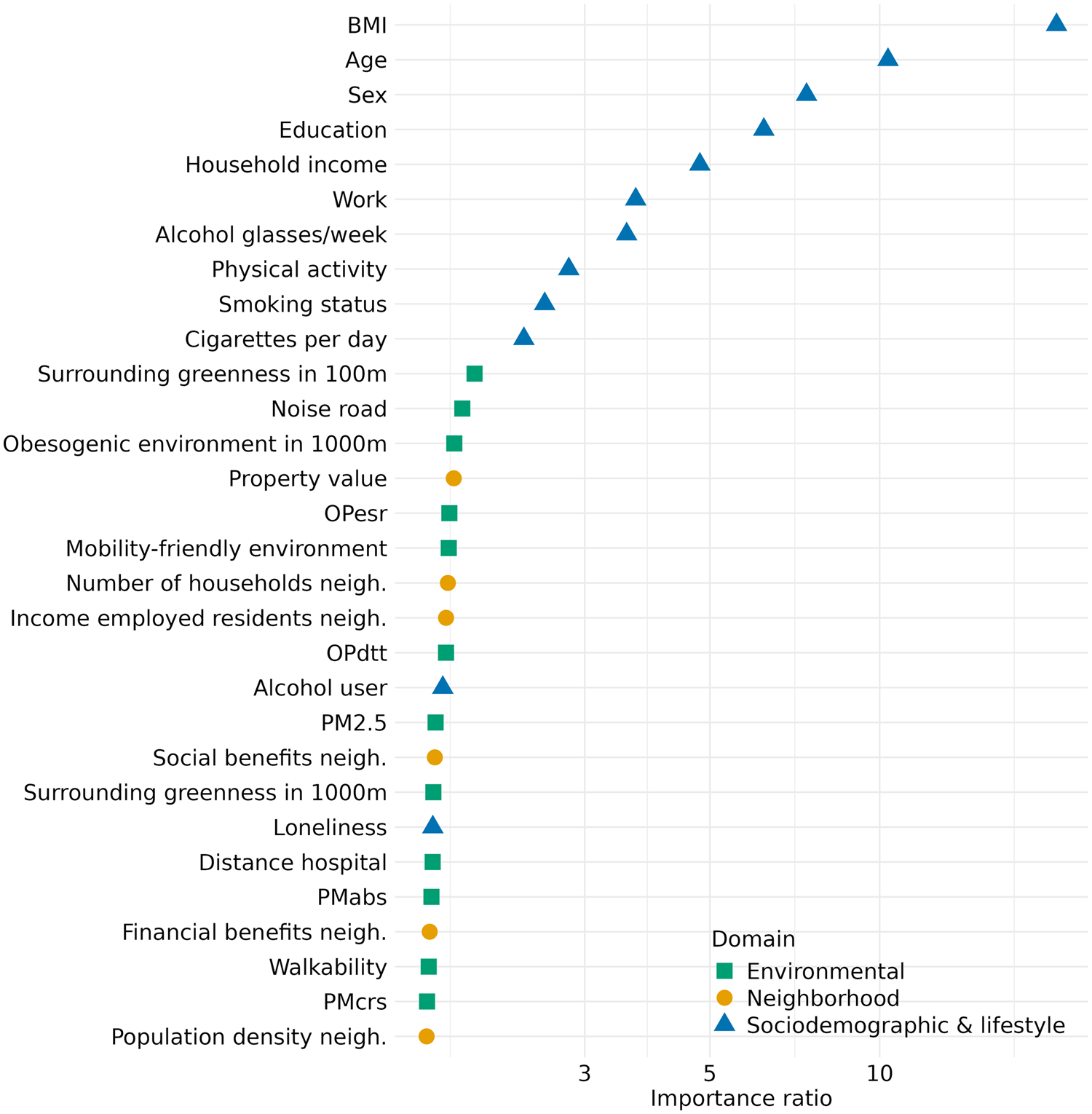 Variable importance ranking of the top 30 ranked exposures in the total population. The x-axis shows the importance ratio which reflects the decrease in model performance when the values of a predictor are randomly permuted. This procedure was performed in triplicate for each of the five undersampled datasets. The average importance ratio across all five undersampled datasets is shown. Color and shapes reflect the domain of the exposure. OPesr: oxidative potential electron spin resonance, neigh: neighborhood, PM2.5: Particulate matter 2.5, OPdtt: oxidate potential dithiothreitol of particle matter, PMabs: Particulate matter absorbance, PMcrs: Particulate matter coarse.