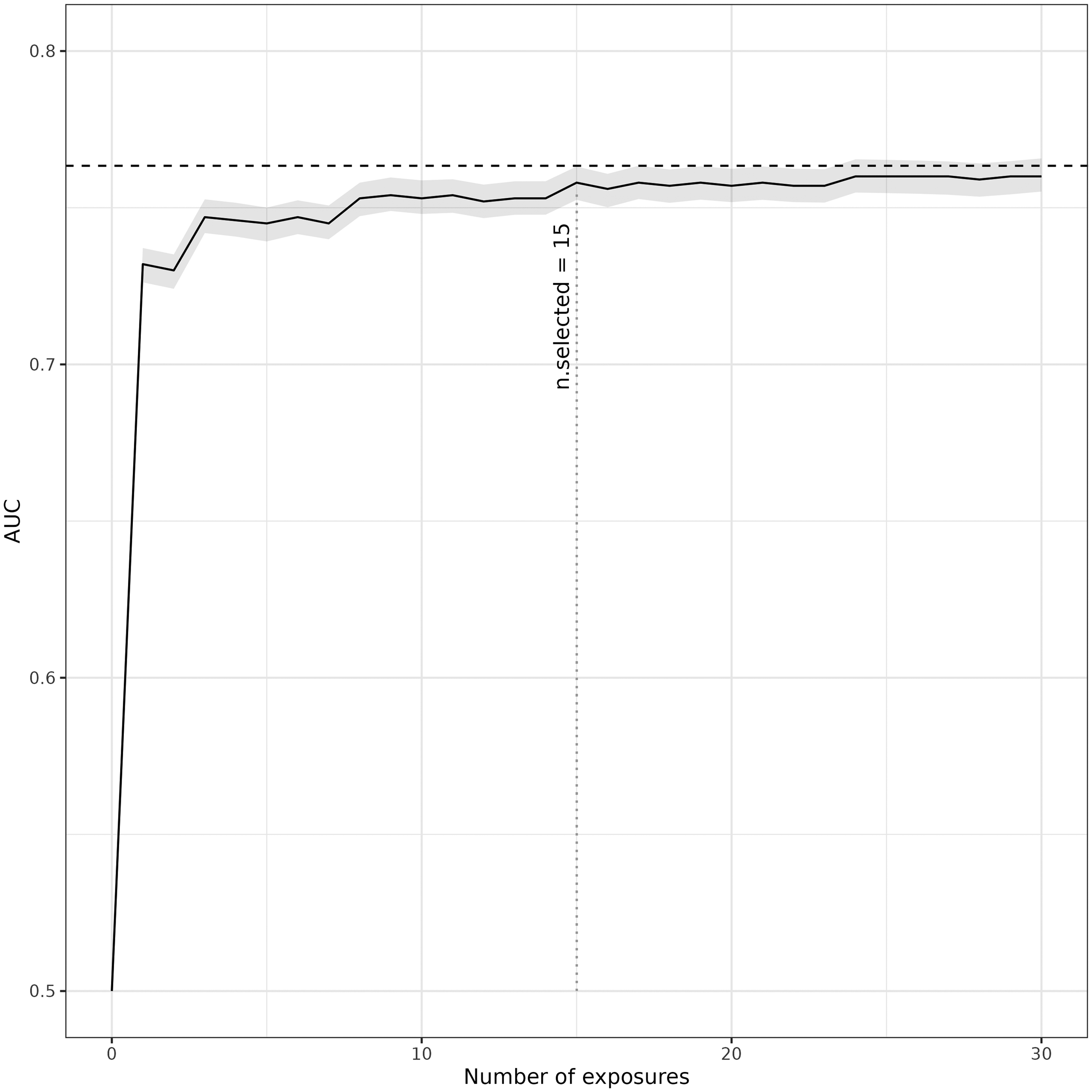 Validation plot on the AUC value of first 30 exposures when the number of exposures is increased in the RF models. 5-fold cross-validation was used to calculate the AUC value and its 95% CI on the sixth undersampled dataset. Variables were added sequentially based on their variable importance ranking. The horizontal line reflects the AUC of the RF model including all exposures.