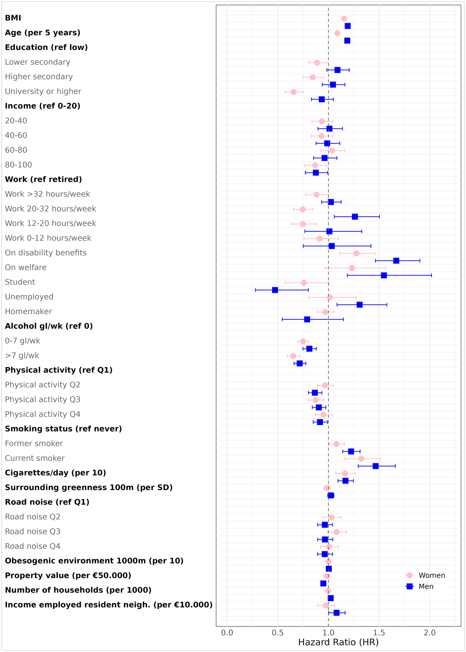 Since especially neighborhood and environmental exposures levels (eg, PM2.5) might change when individuals move, we performed a sensitivity analyses in which we censored all participants who moved during the period of our study. These participants were censored based on the year they moved. Furthermore, to account for potential lifestyle changes during the COVID-19 pandemic, we performed a sensitivity analyses excluding the COVID-19 period, restricting the follow up period to 2013-2019. Lastly, to identify age-specific risk factors, we stratified our analysis by four age groups (younger than 40 years, 40-64 years, 65-79 years and 80 years and older). The variable work was recoded to having a paid job yes/no, because not all categories are applicable to each age group.