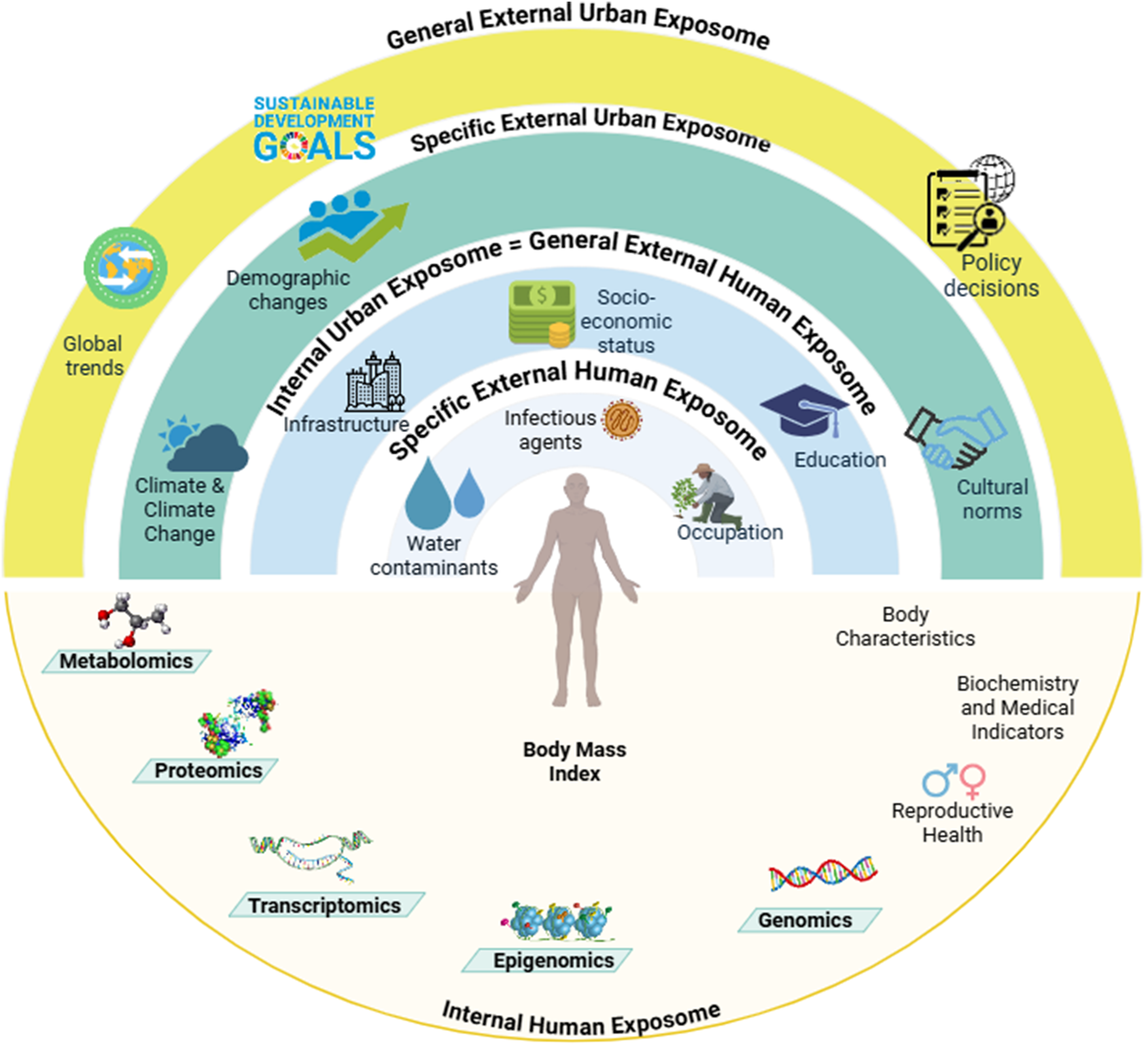 Urban exposome studies require the critical infrastructure and resources of pregnancy birth/population cohorts, registries/survey datasets, as well as the availability of routinely collected environmental (non-genetic) variables. One of the very first urban exposome studies within established cohorts, the Human Early Life Exposome (HELIX) project used exposomic data from six urban EU population-based birth cohorts linking them with -omics signatures and child health outcomes.10 The EXPANSE study studied the impact of the urban exposome on cardiometabolic and pulmonary diseases over the life course of 55 million European inhabitants across 12 countries.11 The Child Cohort Network brought together several EU child cohorts into one data sharing platform, hence investigating the association of repeated measurements of the pregnancy and early life exposome with multi-omics and health outcomes followed up to 18 years of age.12