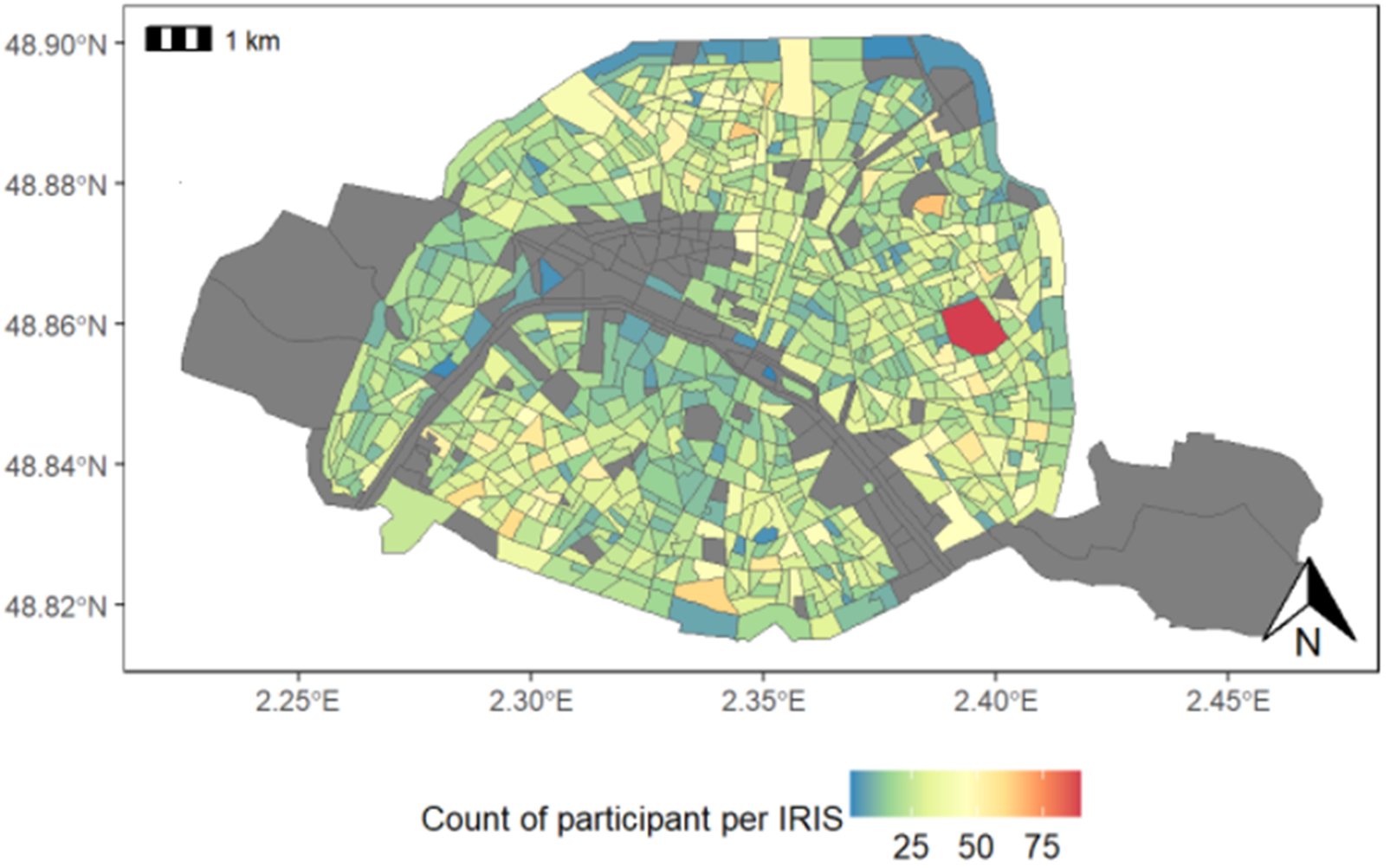 There are 20 municipal arrondissements in the city of Paris, each divided into several IRIS (Îlots Regroupés pour l‘Information Statistique), the fundamental intra-municipal unit.18,19 As per the French National Institute of Statistics and Economic Studies (Institut National de la Statistique et des Etudes Economiques, INSEE), a residential IRIS is a geographical unit area with 1800–5000 inhabitants; there are 992 IRIS in Paris city18 during the study period (2012–2020).20 The degree of urbanization of the provided Paris IRIS was verified using the DEGURBA database of France and cross-validated with the INSEE database of urban units.21,22 In the CONSTANCES cohort, each participant’s home address was recorded at inclusion and updated throughout the follow-up period and geocoded with a precision indicator ranging from the exact address to the centroid of the zip code, then linked to residential IRIS version of 2016, which corresponds to the middle of the inclusion period.