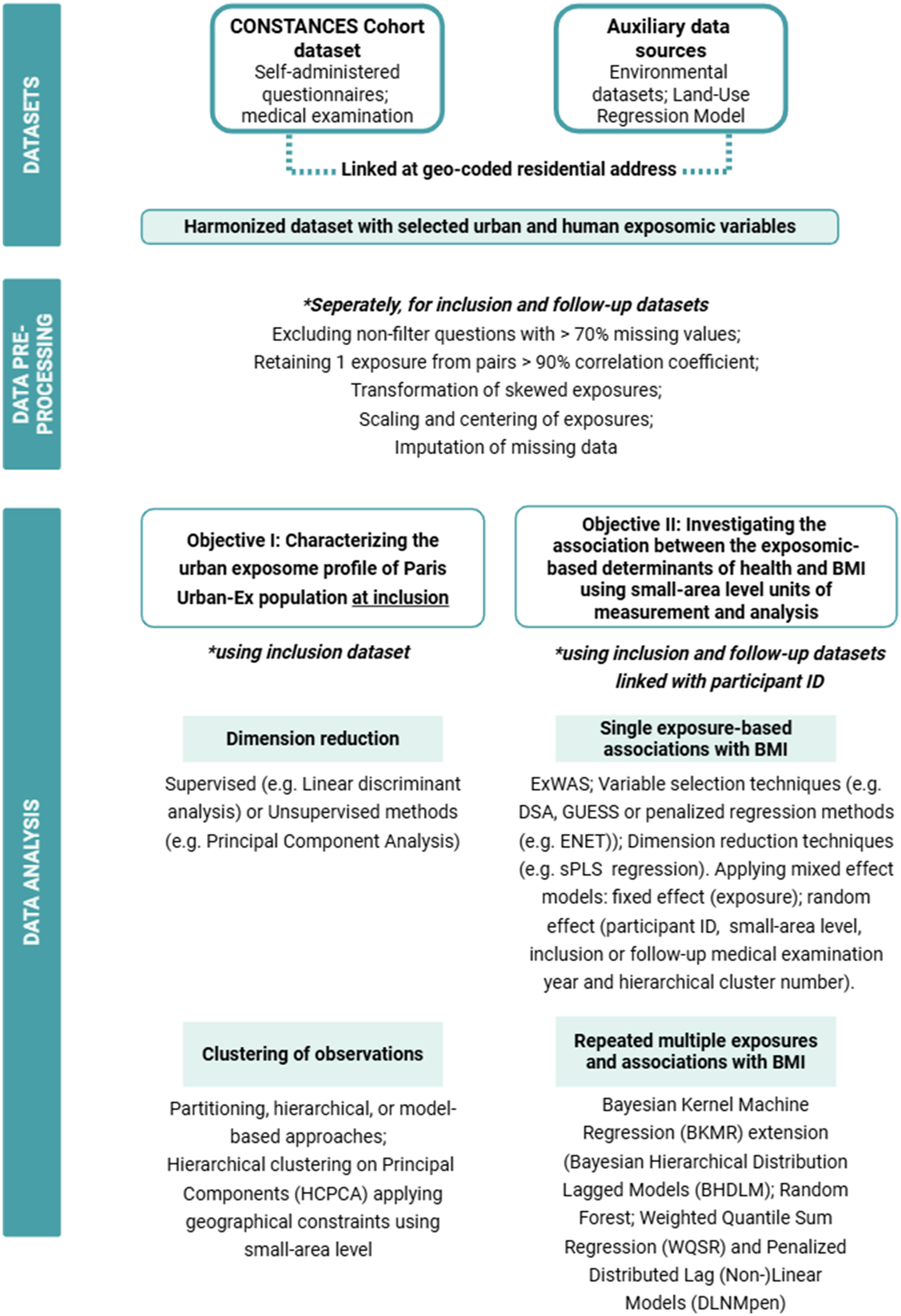 All information obtained from the various auxiliary sources require harmonization and linkage to the CONSTANCES dataset as per the smallest geographic level for which each variable is available. To this, we propose statistical methods that can be conducted in separate packages using R version 4.3.2 and R studio 2024.04.1 and beyond.29,30 These statistical approaches can be further implemented using the hands-on ATHLETE tutorial, which describes their application across key exposome analysis steps: descriptive analysis, visualization, and association analysis.31 “ExposomeShiny” is another R-shiny web-based analytical tool that provides an interactive interface for exploring, visualizing and analyzing exposome datasets.32