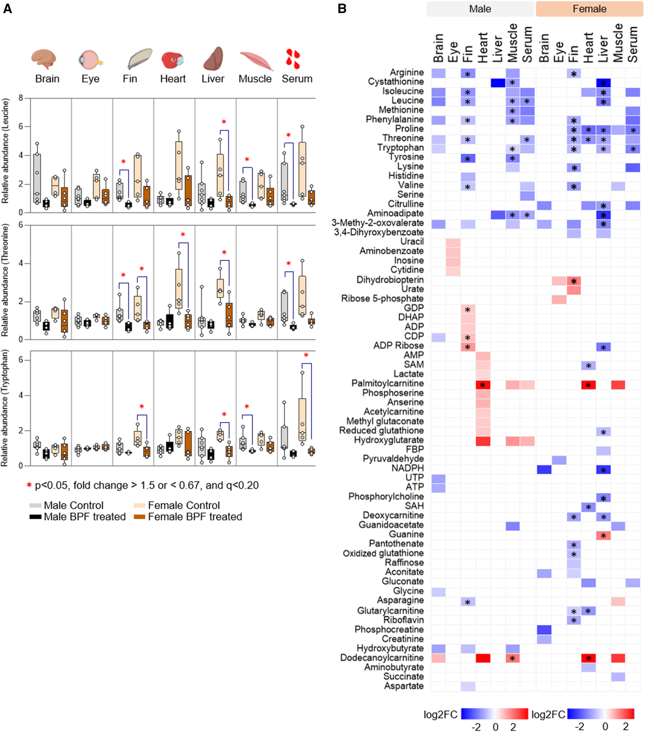 Transient exposure of zebrafish larvae to BPF caused system-wide perturbations in adult metabolites that were specific to sex and tissue. (A) Box plots show relative levels of leucine, threonine, and tryptophan. (B) Heat map shows fold change (treated/control) for selected metabolites across organs for male and female fish. The experiment compared 12 control animals (7 males, 5 females) to 11 treated animals (5 males, 6 females). Metabolites that decrease as a result of BPF exposure have negative log2FC values and metabolites that increase following BPF exposure have positive log2FC values. For clarity, metabolites having a p-value greater than 0.05 or a fold change between 0.67 and 1.5 are displayed without color on the heatmap. Metabolites with a q-value <0.20 are indicated by an asterisk. P-values were calculated by using a Mann Whitney U-test (unpaired). Q-values were calculated by using the Benjamini-Hochberg Procedure to control for false discovery rate. Fold changes, p-values, and q-values are provided in Table S3.