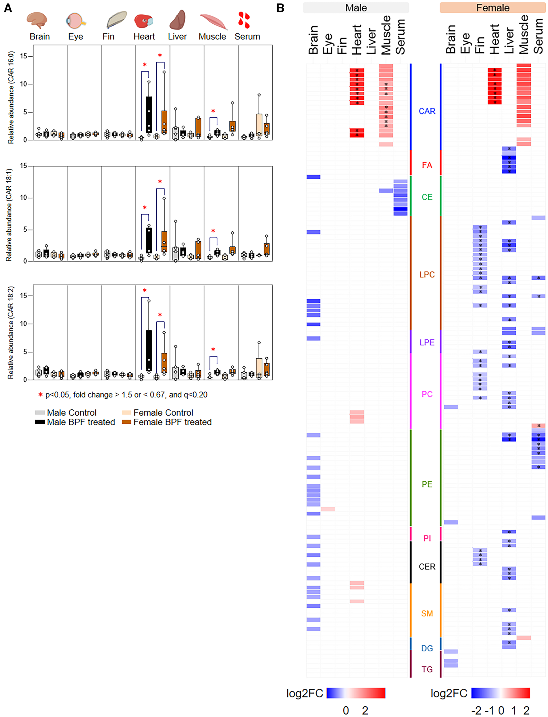 Transient exposure of zebrafish larvae to BPF caused system-wide perturbations in adult lipids that were specific to sex and tissue. (A) Box plots show relative levels of acylcarnitine 16:0 (CAR 16:0), acylcarnitine 18:1 (CAR 18:1), and acylcarnitine 18:2 (CAR 18:2). (B) Heat map shows fold change (treated/control) for selected lipid species across organs for male and female fish. The experiment compared 12 control animals (7 males, 5 females) to 11 treated animals (5 males, 6 females). Lipids that decrease as a result of BPF exposure are shown with negative log2FC values and lipids that increase following BPF exposure with positive log2FC values. For clarity, lipids having a p-value greater than 0.05 or a fold change between 0.67 and 1.5 are displayed without color on the heatmap. Lipids with a q-value <0.20 are indicated by an asterisk. P-values were calculated by using a Mann Whitney U-test (unpaired). Q-values were calculated by using the Benjamini-Hochberg Procedure to control for false discovery rate. A more detailed heatmap including all the names of each lipid species is shown in Figure S5. A combined analysis of acylcarnitines from males and female is shown in Supplementary Figure S6. Fold changes, p-values, and q-values are provided in Supplementary Table S3.