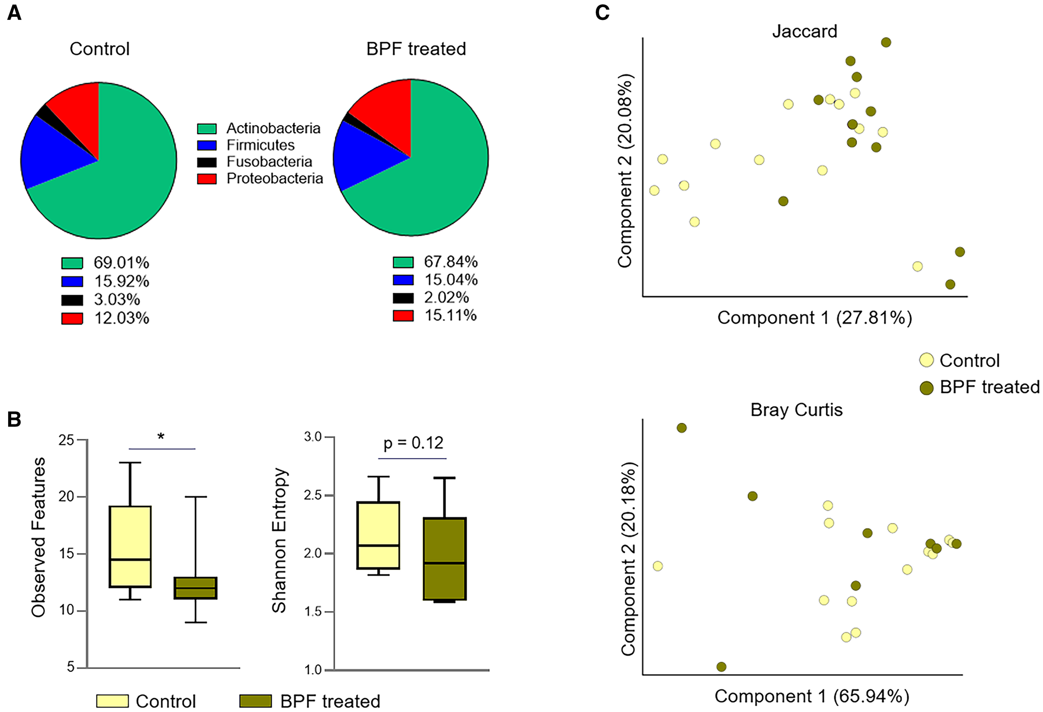 A transient exposure to BPF during the developmental phase of life altered the gut microbiome of adult animals. (A) Relative abundance of major phyla in control (n = 14) versus BPF-treated (n = 11) adult fish. (B) Alpha diversity as measured by using observed features and Shannon entropy. P-values were calculated by using a Kruskal-Wallis pairwise comparison (* indicates P < 0.05) (C) Beta diversity is displayed by using PCoA plots of Bray Curtis and Jaccard.