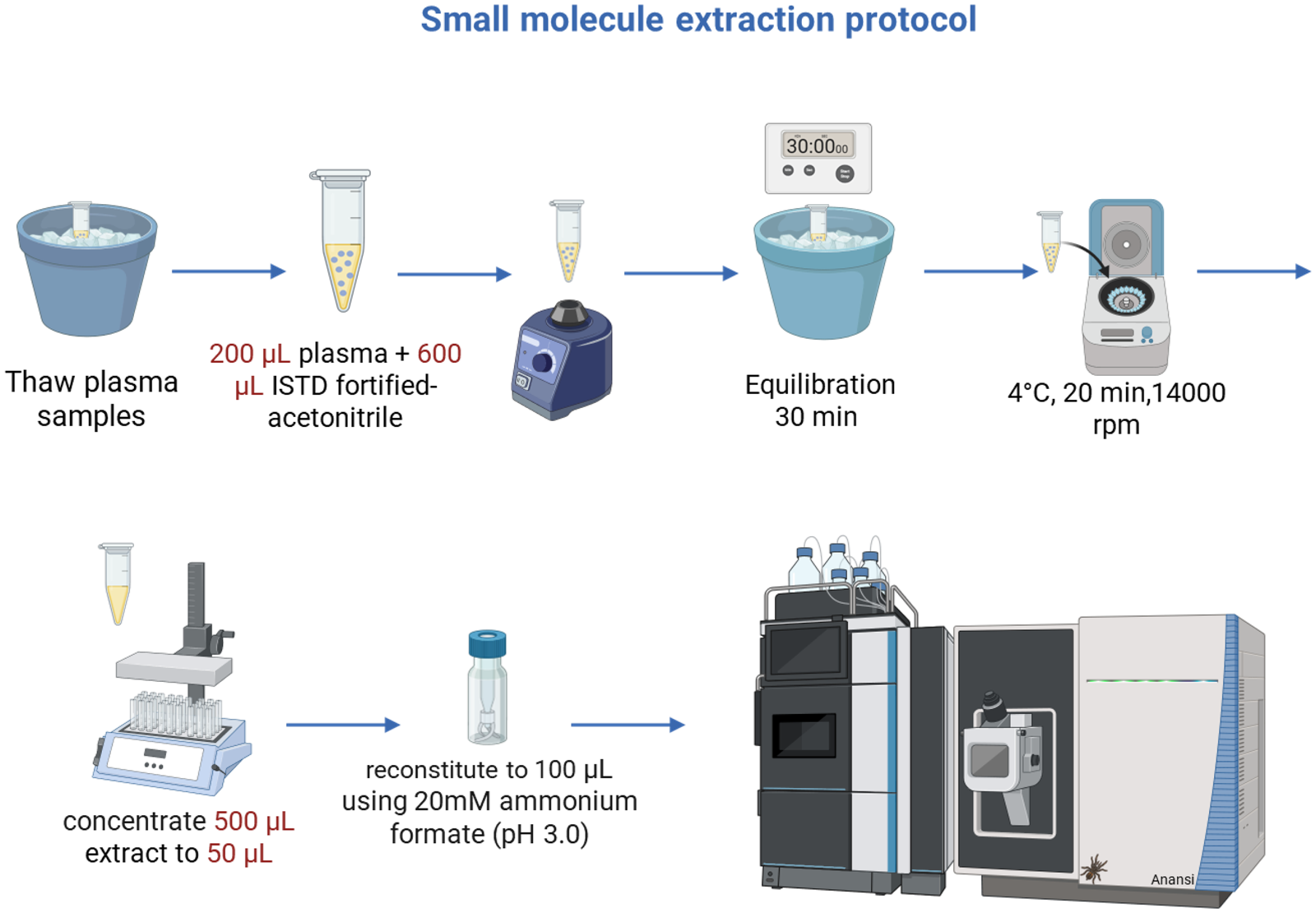 Protocol for extracting and analyzing small molecules from human plasma. Abbreviations: RPM = Revolutions per minute. μL= Microliter. Analyte separation of plasma samples was performed using an Orbitrap IQ-X mass spectrometer equipped with a Waters CORTECS Premier C18 column (2.1 × 150 mm) for reversed phase chromatography. All samples were analyzed in positive ionization using the data-dependent acquisition mode. Figure made using BioRender.