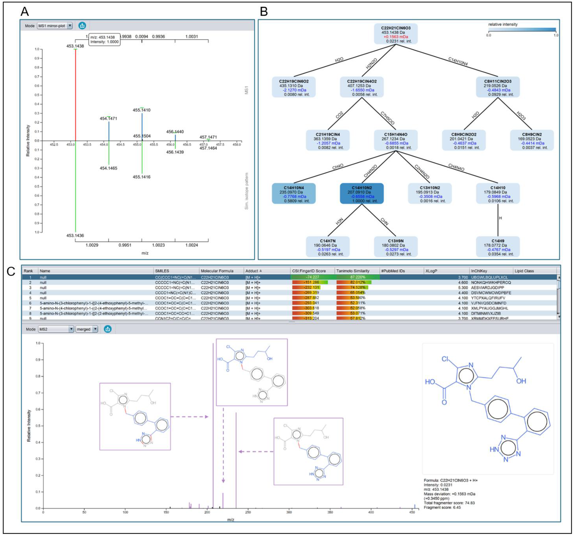 SIRIUS analysis identified a downstream metabolite of the anti-hypertensive drug losartan. (A) The MS1 mirror plot showed strong agreement between the experimental formula and the simulated formula. (B) The formulas for the fragments were calculated and constructed like a tree to show neutral losses. (C) The experimental fragments were matched to the candidate molecular structure: losartan carboxylic acid.