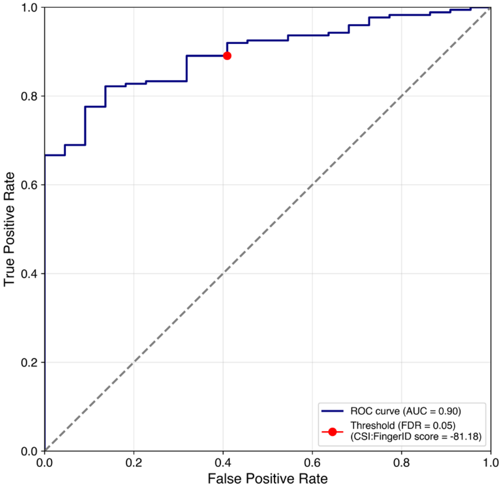 To determine a practical way of using CSI: FingerID scores to gauge the accuracy of feature predictions, we compiled the scores for the 196 features that had annotated matches in the ENTACT 506 mixture and performed a Receiver Operating Characteristic (ROC) analysis. The analysis resulted in an Area Under the Curve (AUC) of 0.90, indicating high discriminatory performance (Figure 3). Subsequently, we established a practical CSI: FingerID score threshold of -81.18 by controlling the False Discovery Rate (FDR) at 5%.