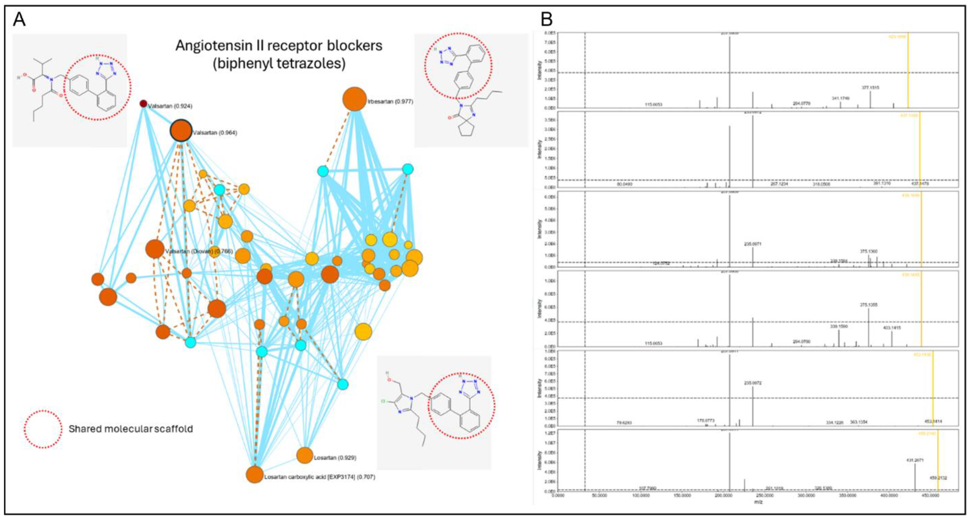 Representative fragmentation patterns of features that are related to the drug losartan. (A) shows the molecular network between structurally related compounds. (B) shows the comparison of some of the MS2 spectra of features that belong to the same network. Yellow lines represent the molecular ion.
