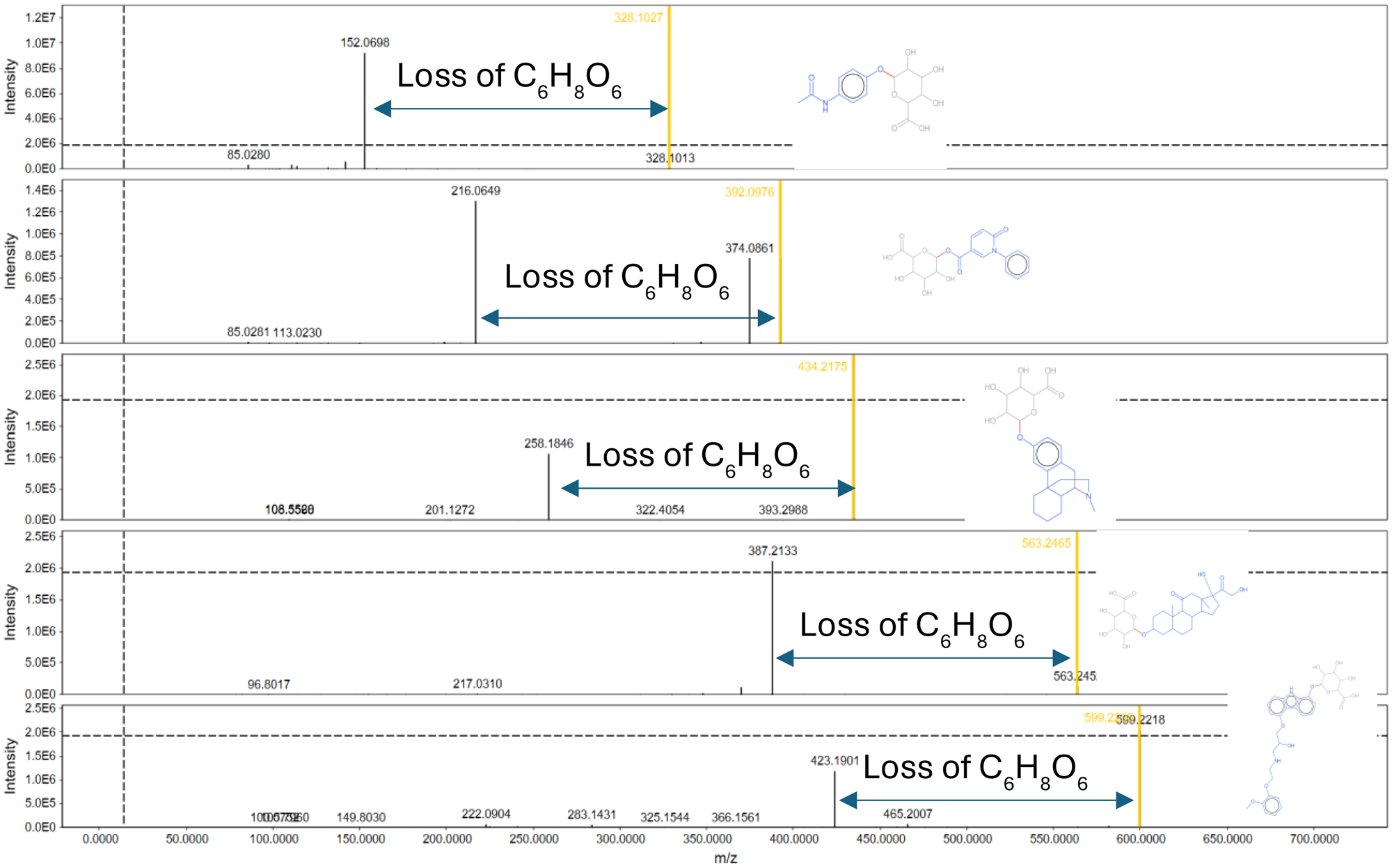 Fragmentation spectra of glucuronidated drug metabolites that cluster together in a molecular network. Top to bottom: acetaminophen glucuronide, pirfenidone glucuronide, dextromethorphan glucuronide, aldosterone glucuronide, 8-hydroxycarvedilol O-glucuronide. The fragmentation spectra cluster together in a molecular network due to the major fragment in their respective MS2 spectrum coming from the neutral loss of C6H8O6.