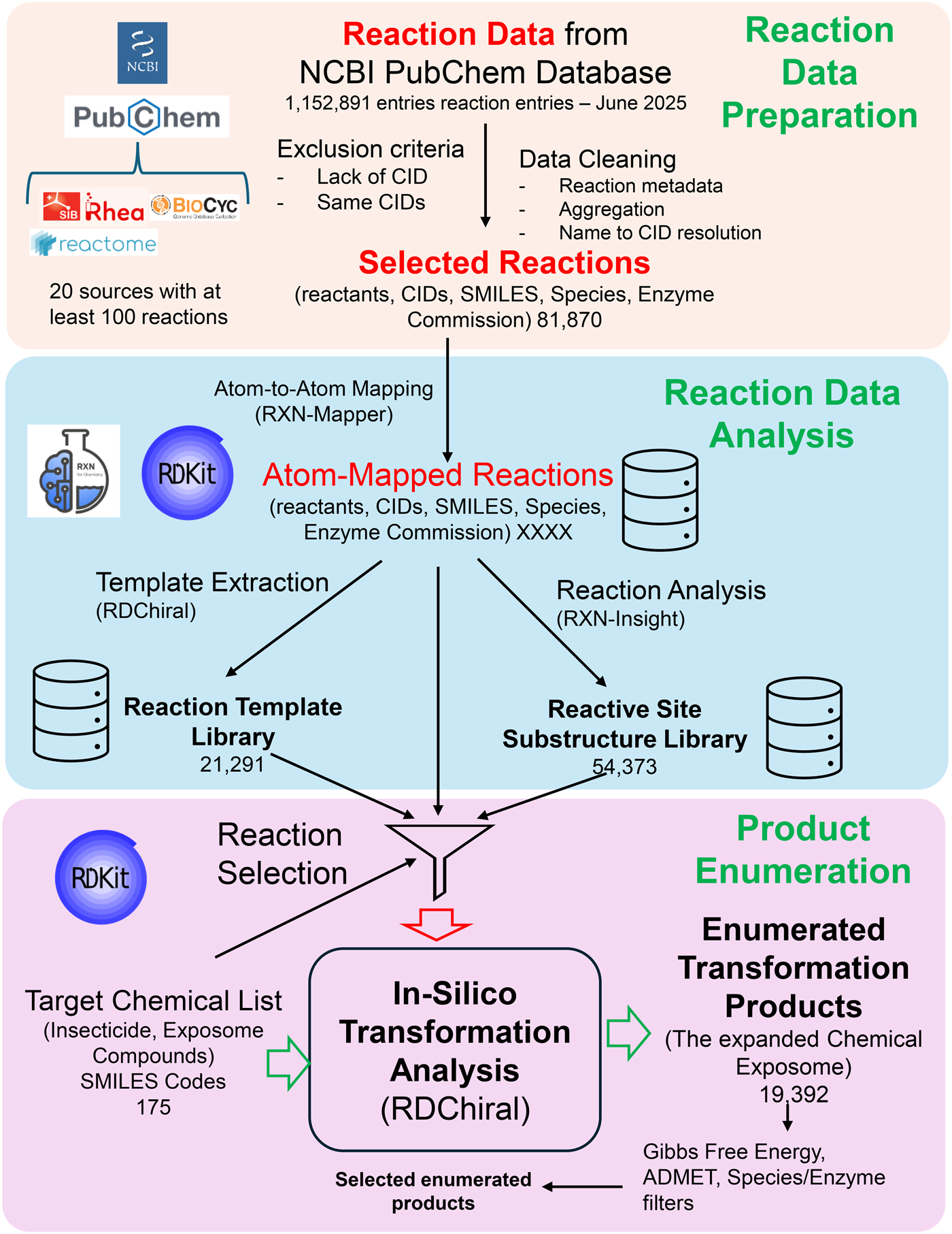 Overview of the in-silico transformation analysis (ISTA) workflow. Reaction data is aggregated from the NCBI PubChem database, incorporating sources such as Rhea, BioCyc, and Reactome. The raw data undergoes cleaning and exclusion criteria (eg, removing entries with missing or duplicate CIDs) to yield a curated set of selected reactions. The selected reactions are then processed using RXNMapper to generate atom-to-atom mappings. This mapped data is then analyzed to create two key libraries: a Reaction Template Library generated via RDChiral (containing 21 291 templates) and a Reactive Site Substructure Library generated via Rxn-INSIGHT (containing 54 373 substructures). Next, the generated libraries are applied to a target list of chemicals (eg, insecticides) to predict potential biotransformations. The In-Silico Transformation Analysis enumerates 19 392 unique major transformation products, which are subsequently prioritized using filters for Gibbs Free Energy, ADMET properties, and species/enzyme associations.