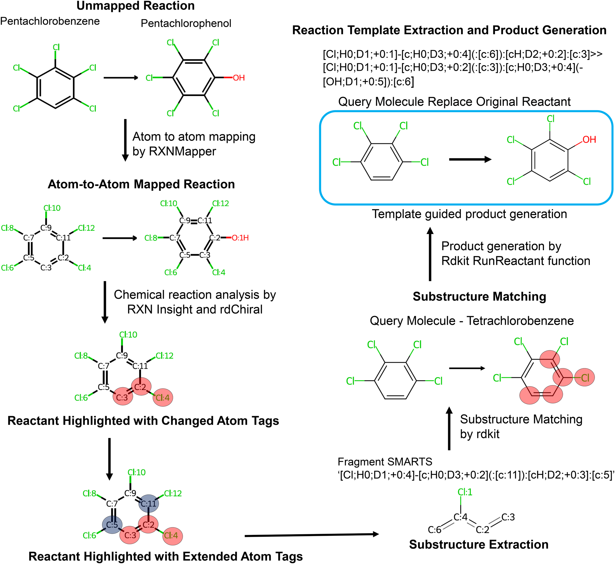 Template guided enumeration of transformation products. The workflow begins with atom-to-atom mapping of archived chemical/biochemical reactions using RXNMapper. From these mapped reactions, reactive sites, atoms that undergo changes during the reaction were identified, and corresponding substructures were extracted from the reactants. The chemical transformation templates that define transformation patterns were generated from atom-to-atom mapped reaction using the rdChiral, a python library. For a given query compound, substructure matching was performed using RDKit and corresponding transformation template was applied to generate potential transformation products. The workflow is exemplified by the transformation of pentachlorobenzene into pentachlorophenol.