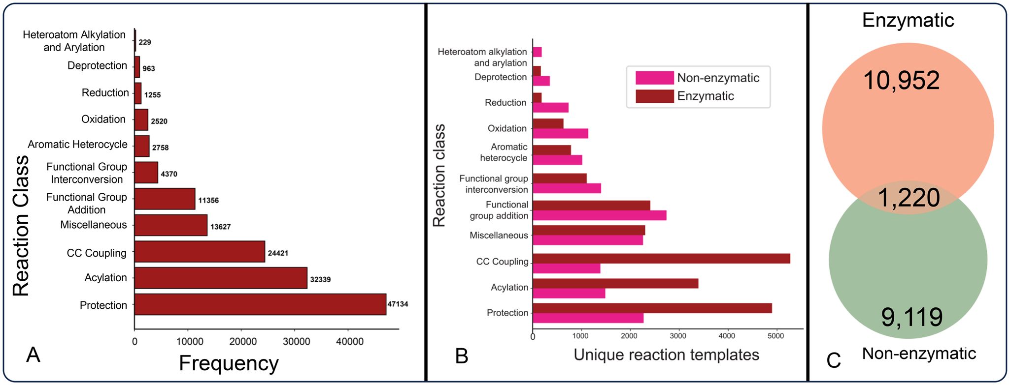 Overview of the reaction data sourced from the PubChem Database. Figure 3A shows the total number of reactions for each reaction class, for which transformation template has been generated. 3B shows the count of unique reaction templates. 3C represents distribution of unique chemical transformation templates extracted from enzymatic and non-enzymatic reactions, including the number of overlapping shared between the two categories.