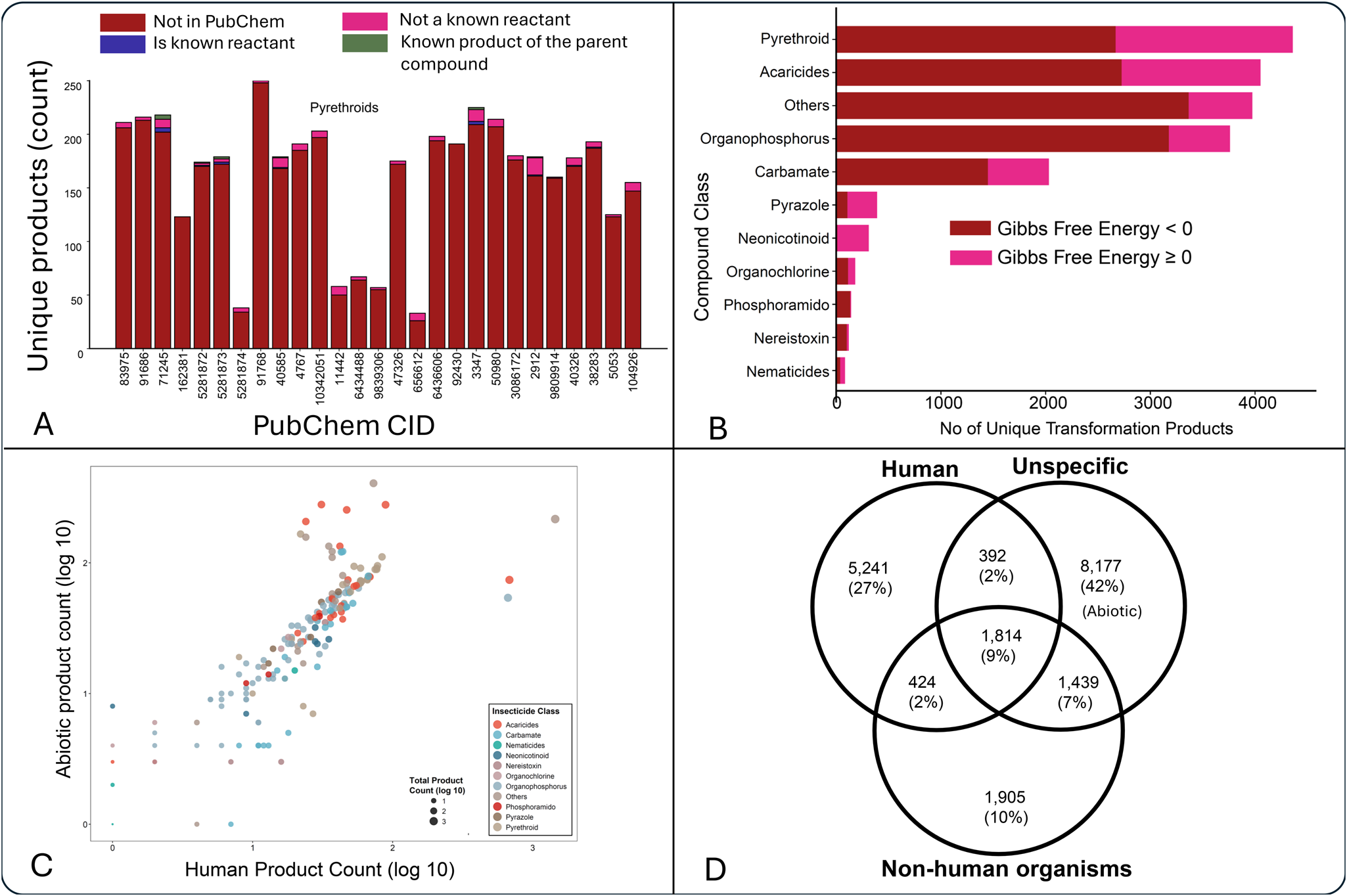 Analysis of transformation products of pesticides. (A) Unique products per compound. It shows the count of unique transformation products for selected parent compounds identified by their PubChem CID for Pyrethroids class. The colors indicate the status of each product: Not in PubChem (dark red), Not a known reactant (pink), Is a known reactant (dark blue), and Known product of the parent compound (green). (B) Transformation products by compound class and thermodynamics. It displays the total number of unique transformation products categorized by compound class. It shows the proportion of reactions with a change in Gibbs Free Energy < 0 (spontaneous, dark red) and ≥ 0 (non-spontaneous, pink). (C) Comparison of human and abiotic product counts. It compares the log10-transformed counts of products formed through human metabolism (x-axis) versus abiotic degradation (y-axis). The points are colored according to the Insecticide class, and their size is proportional to the log10-transformed total product count. (D) Overlap of transformation products across systems. The Venn diagram illustrates the distribution of transformation products based on the systems in which they are formed: Human, Non-human organisms, and Unspecific (Abiotic). The diagram shows the number and percentage of products that are unique to each system or shared between them.
