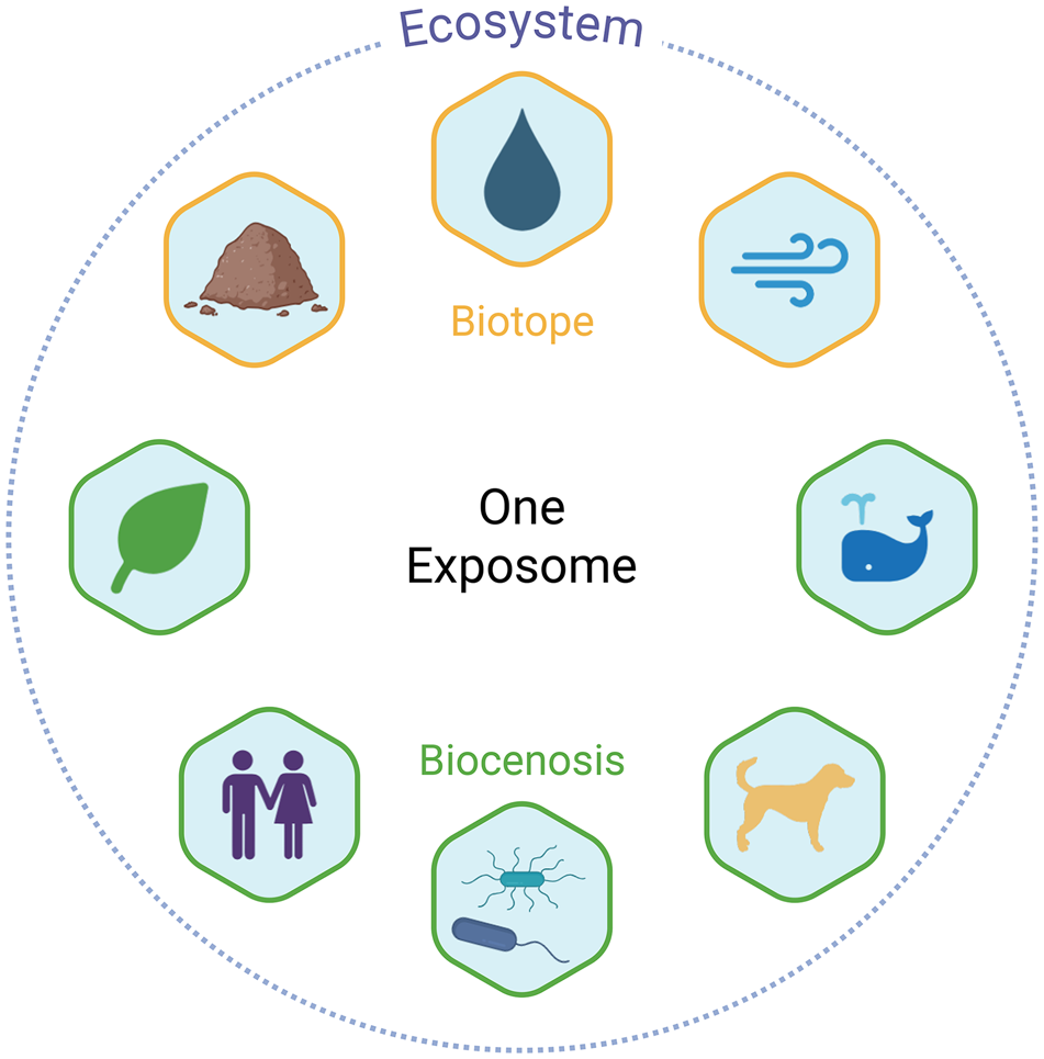 It should be noted that the idea of linking ecosystems with the exposome is not new. Indeed, the late Paul Lioy suggested the term eco-exposome as a framing for this interaction. This terminology was used in the U.S. National Research Council Report on Exposure Science in the 21st Century15 as a way to address exposures that derive from outside of the body (similar to what Christopher Wild described as the general external exposome). Since that time, these external factors are clearly included in the definition of the exposome, eg, the Banbury Definition.7 At the same time, it appeared that the report from Dr Lioy was more focused on exposures that come from the ecosystem and not the exposome of the ecosystem itself, namely the internal and external exposomes for living beings (biocenosis), and the external exposome for biotopes, which might be shared and exchanged between entities. A recent initiative tended to record data from the environment to include it into the exposome framework.16 These data mainly represent abiotic factors (air, water, soil) obtained from environmental agencies, with the ultimate goal to be linked to human health risk. As noted above, most research on the exposome has continued to be human/sapiocentric, thus requiring the distinction introduced in this commentary.