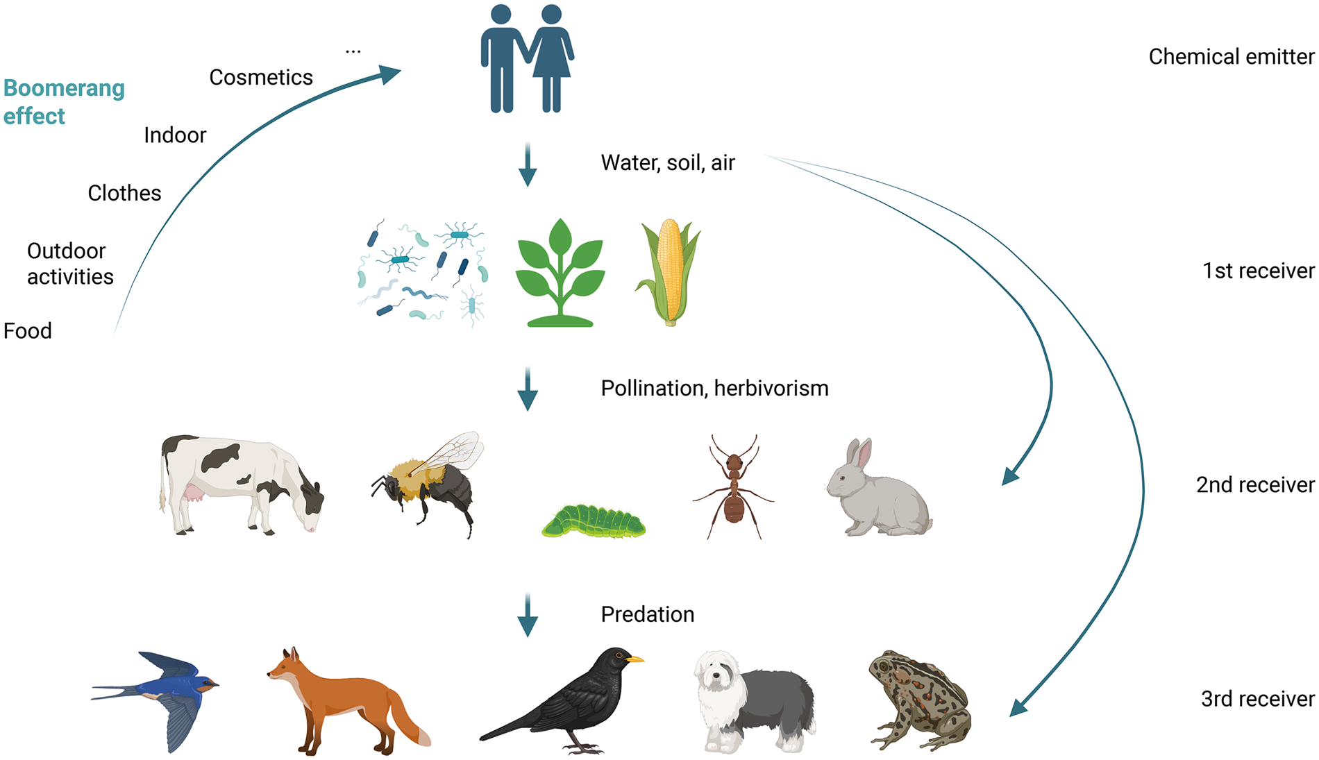 The boomerang effect. An example of the boomerang effect illustrated with chemicals released by anthropogenic activities (micropollutants), spreading through trophic networks and coming back to humans. Many human medications are excreted through urine and make their way into the water systems where they are absorbed or consumed by the 1st, 2nd, or 3rd receiver. Alternatively, the 2nd or 3rd receiver may be exposed by ingestion of the 1st receiver leading to the classic bioaccumulation seen throughout nature. Created in BioRender. Heintz, D. (2025) https://BioRender.com/93lia25.