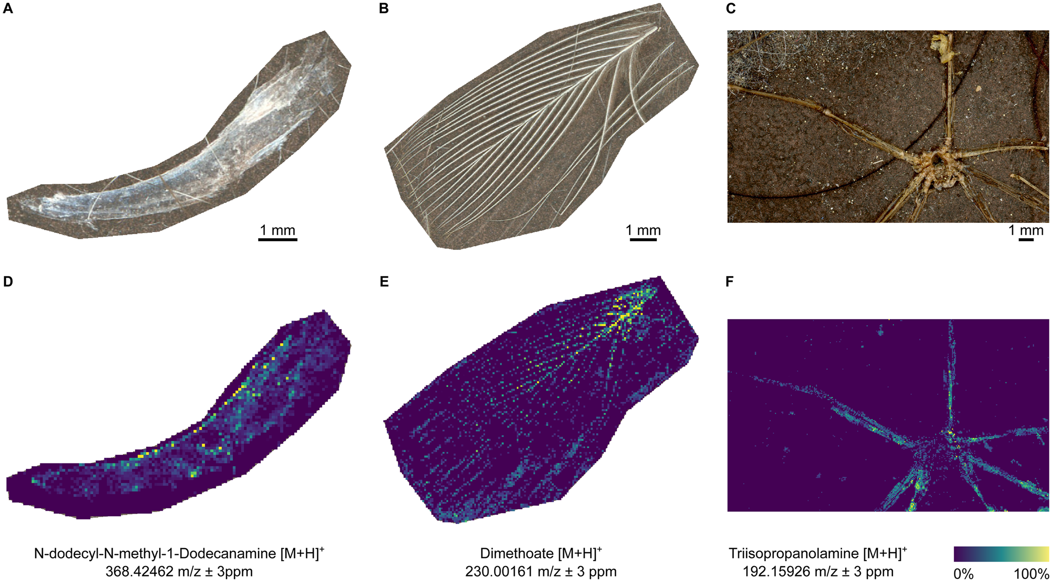 Proof-of-concept use of mass spectrometry imaging to analyze micropollutants in environmental samples. Optical images of cat claw (A), zebra finch fluff (B), and spider full-body recovered from a vacuum cleaner (C). Hazardous chemicals were successfully detected in all the samples as depicted by the molecular images obtained (D–F). Some of these chemicals are of emerging concern, with estrogen and/or androgen receptor activity, carcinogenicity and are irritant for eye and skin, according to the CompTox Chemicals Dashboard (https://comptox.epa.gov/dashboard/). Annotations are at the level 3 of Schymanski classification.47